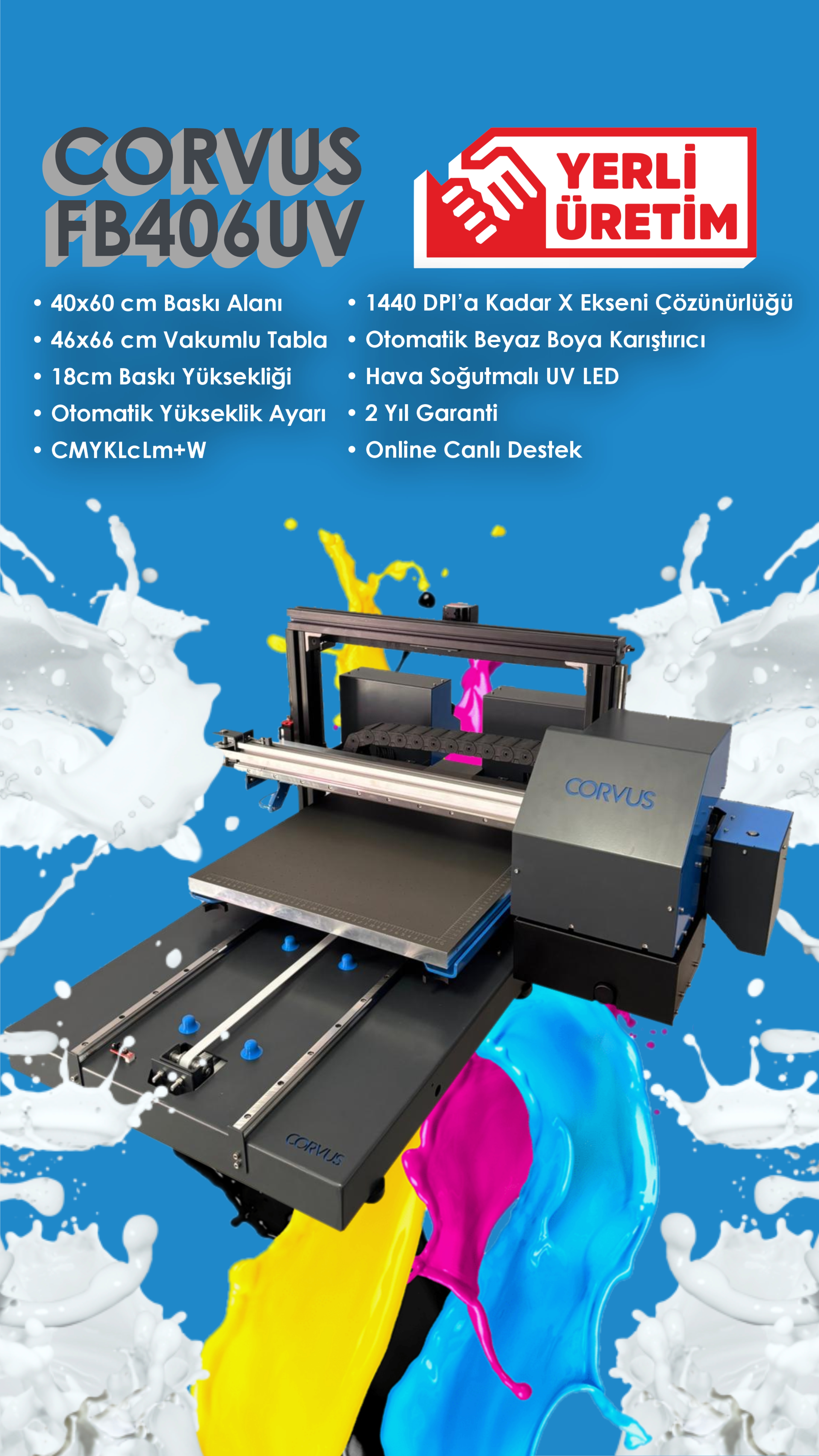 40x60 Baskı Alanı ve 18cm Baskı Yüksekliği ile bir çok alanda kullanıma uygun. Kompakt tasarımı sayesinde ufak alanlarda da çalıştırabileceğiniz, vakumlu tabla, otomatik yükseklik algılama, otomatik boya karıştırma ve hava soğutmalı UV lede sahip, 7 renk UV masaüstü yazıcıdır.